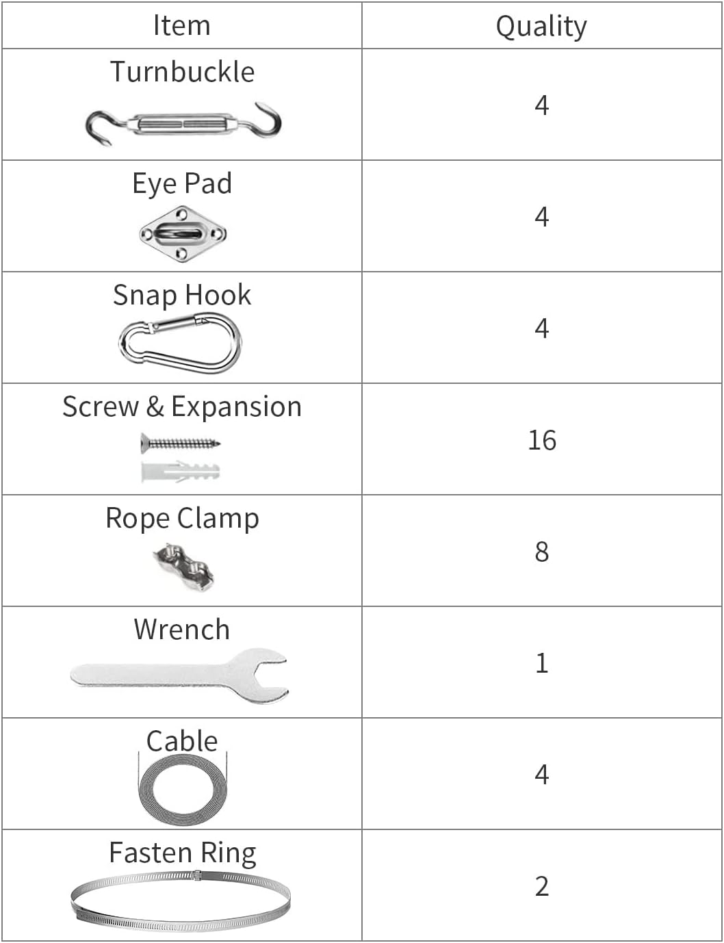We are confident that our shade sail hardware is designed and made under strict quality standards to offer the best sun shade sail installation and experience. Please communicate with us if you get any problems with your order. We will respond as soon as we receive the message. So buy with confidence!